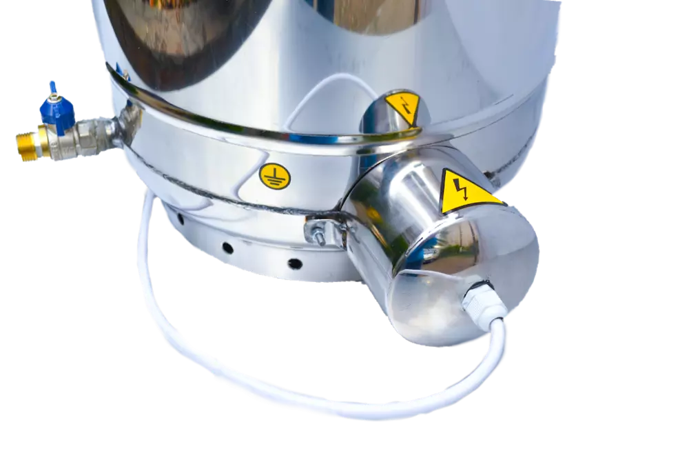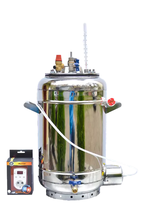 Вертикальный автоклав изготовлен из нержавейки (толщина 1,2 мм), оборудован термометром (до 150 С), манометром (6 атм), взрывным клапаном (6 бар) и краном-золотником для накачки воздуха. Взрывной клапан стравливает воздух в случае роста давления выше 6 бар.